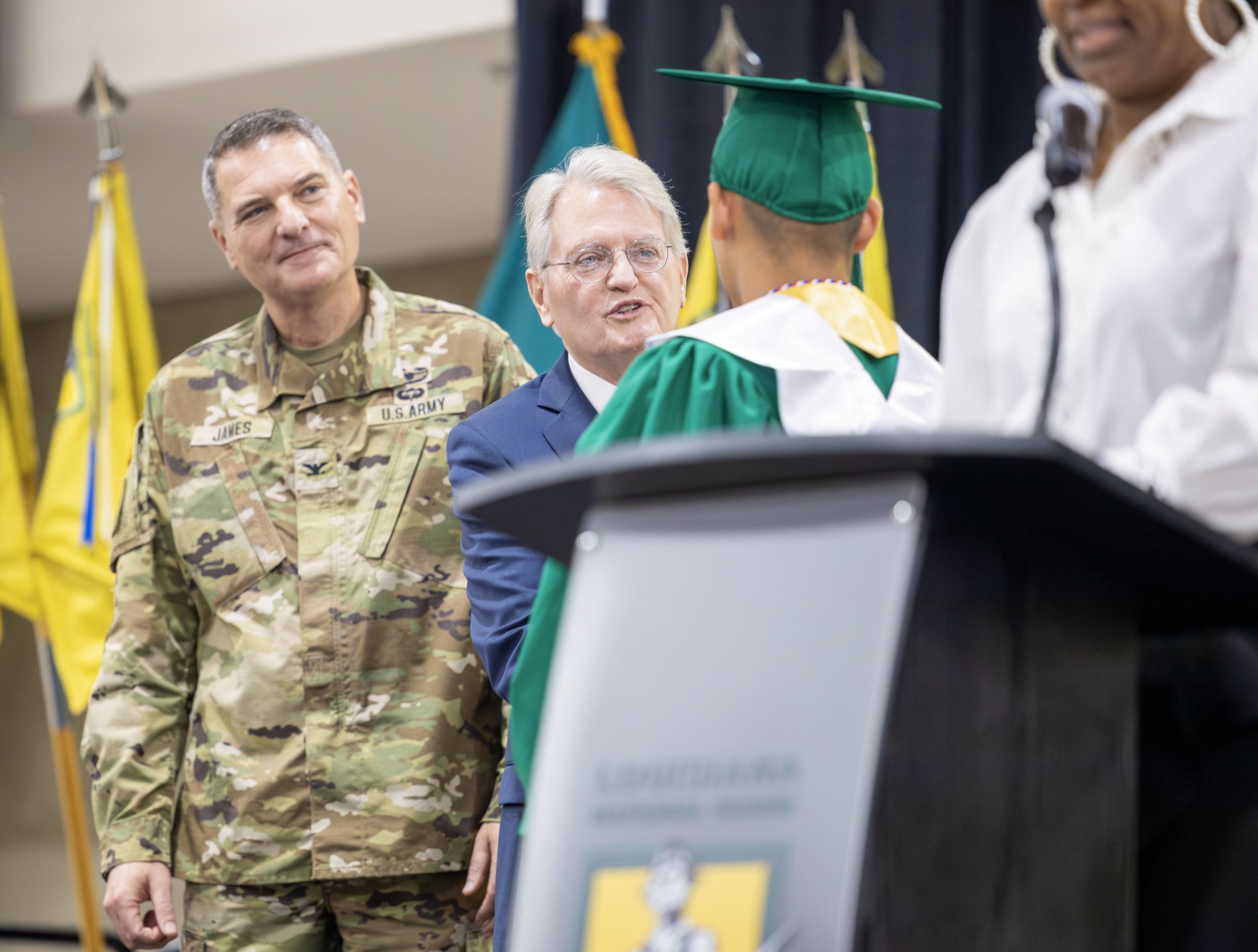 Presiding over the ceremony were Col. Kevin W. James, commander of the 199th Regiment (Regional Training Institute); Lt. Col. Kenneth D. Paul, director of Louisiana National Guard Education Programs; and the Honorable Mike Johnson, Louisiana state representative for District 27.