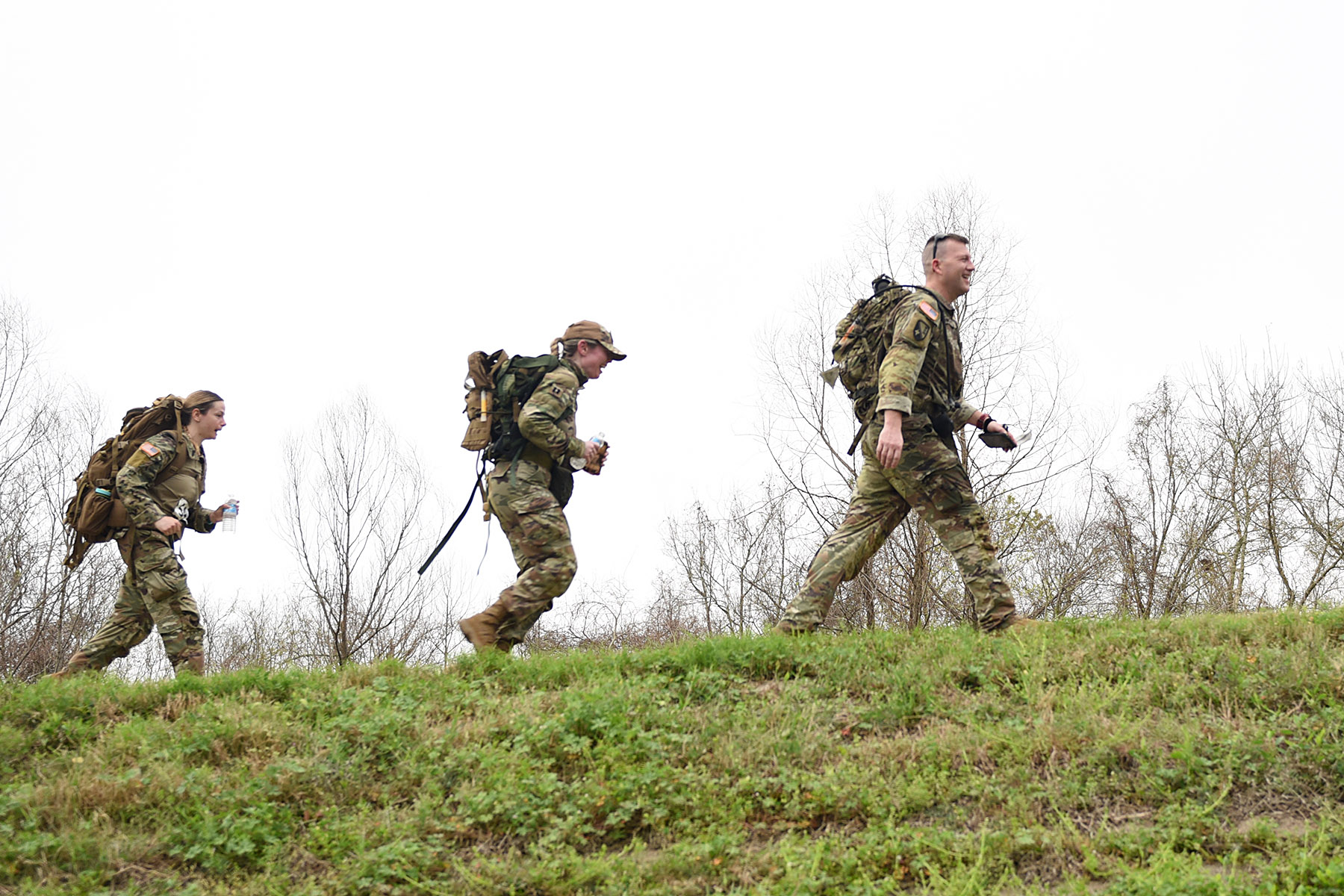 Participants march 18.6 miles while carrying a 25-pound rucksack and must complete the course within a designated time based on their age group to earn the Norwegian Foot March badge.
